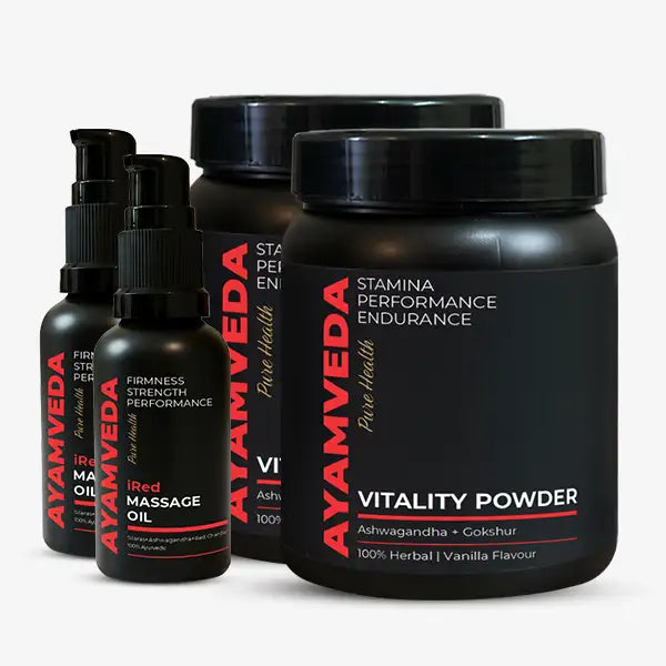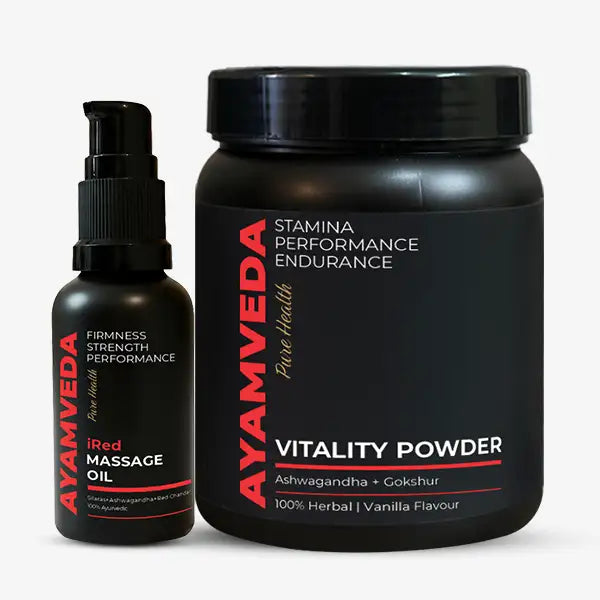 How to use: Oil — 7–8 drops twice daily, massage 2–3 minutes. Vitality Mix — 3 scoops (≈3g) twice daily with warm milk or water.