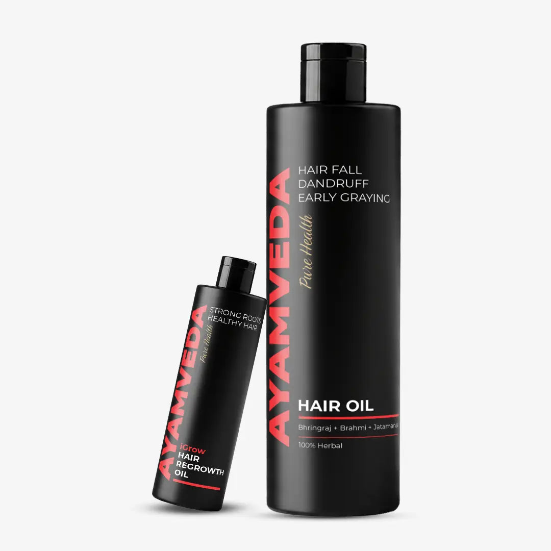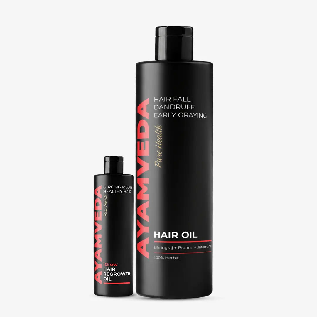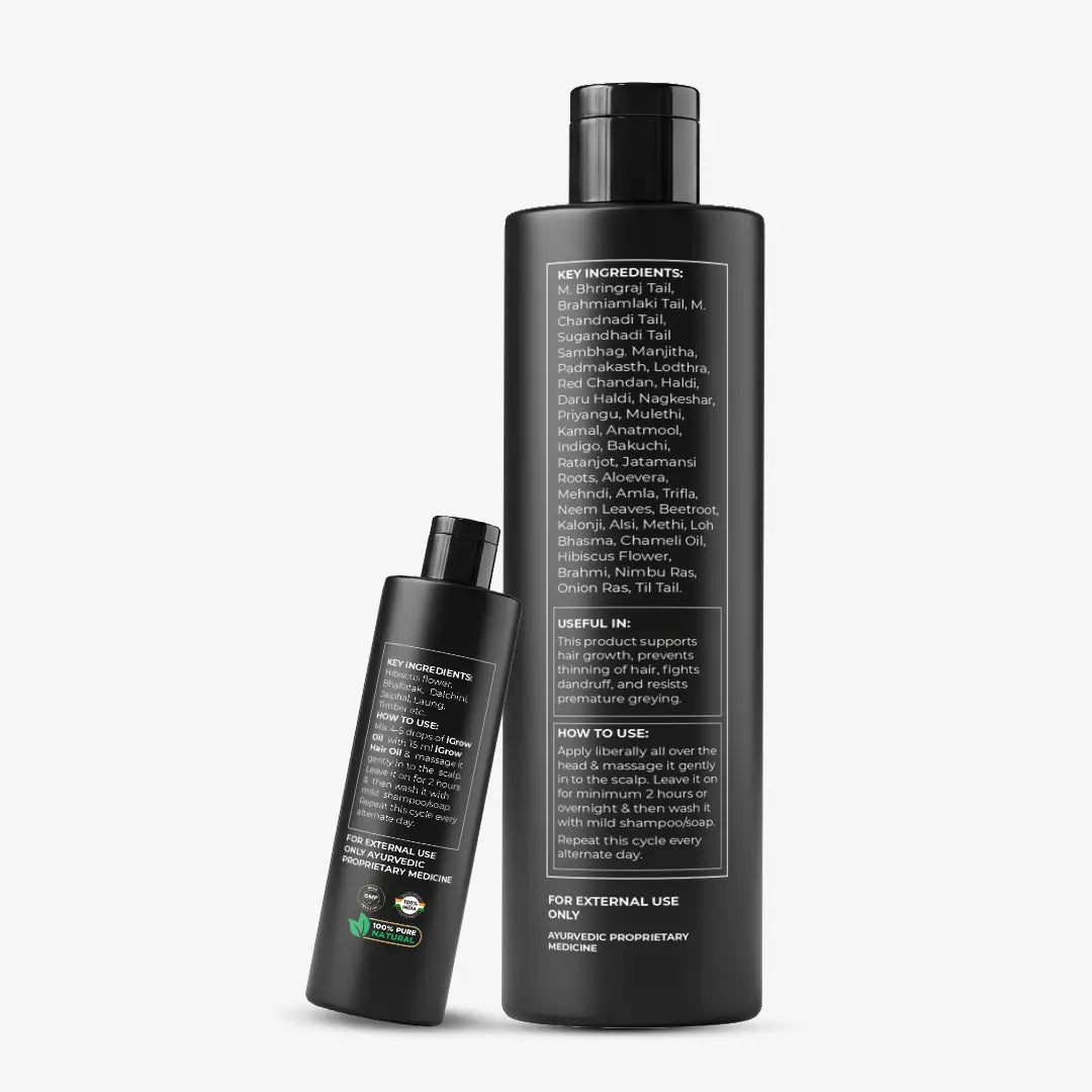 iGrow Combo is packed with essential nutrients from herbs like Bhallatak, Onion Ras, Hibiscus flower, M. Bhringraj Tail etc which get absorbed via your scalp, helping provide complete nourishment to the roots of your hair, helping in stopping hairfall, removal of tough dandruff, preventing premature grey hair & robust regrowth of lustrous hair.