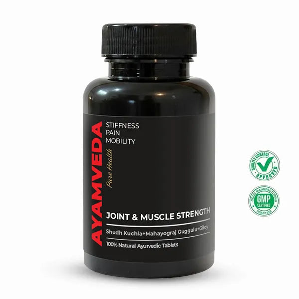 Ayurvedic herbs in iFit Tabs like Shudh Kuchla (Strychnos nux-vomica), Kutki (Picrorhiza kurroa), and Giloy (Tinospora cordifolia) help with joint pain relief through their anti-inflammatory and analgesic properties. They help to reduce inflammation in joints, alleviate pain, & promote detoxification to remove toxins that contribute to joint discomfort. These herbs also support immune function, which is crucial for maintaining joint health and mobility.